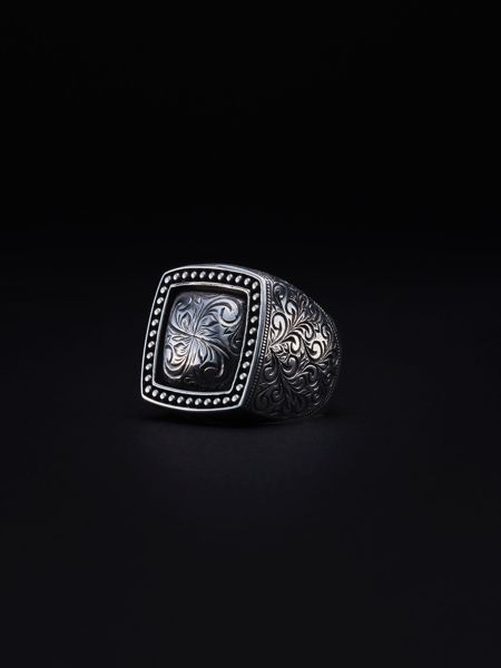 Antidote Buyers Club(アンチドート バイヤーズ クラブ)のEngraved Mafia Ring(マフィアリング)になります。Silver950をベースに、台座中央、周りには細かなオーナメント柄の彫金が入った重厚感、高級感のあるアイテムに仕上がっています。