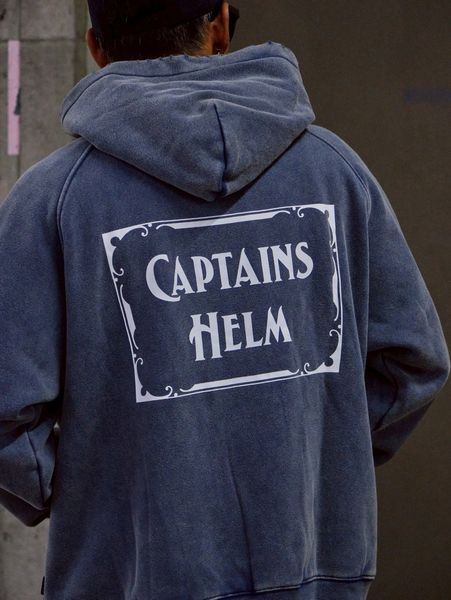 CAPTAINS HELMの26SS新作の" VINTAGE LOGO HOODIE"になります。軽く温かい裏起毛生地を採用したフーディー。ビンテージ加工を施し、袖や裾のリブにダメージ加工を施しました。ラングランスリーブのリラックスシルエット。ポリエステルを混ぜることで、ピリングし辛く長く着れる仕様に。胸にはシンプルにロゴの刺繍を背中にはメイングラフィックをラバープリントしました。