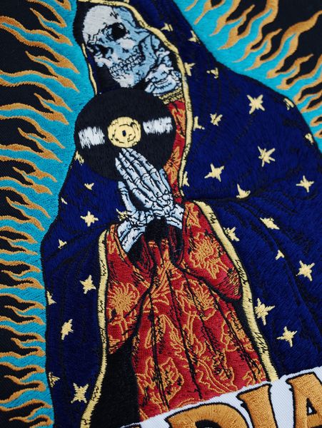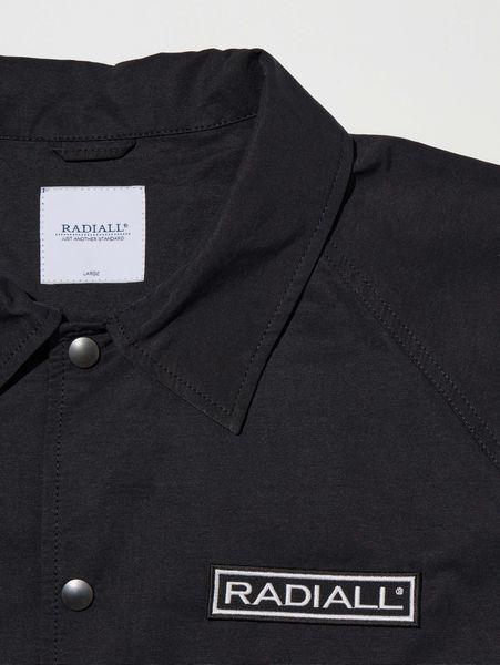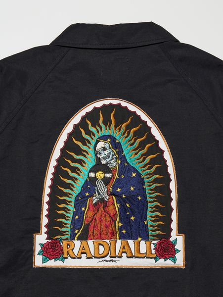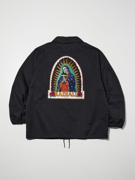 RADIALLの2026 NEW YEAR MERCHの新作”GUIDANCE -Windbreaker Jacket ”になります。カラー / Blackマットな質感で、厚みのあるコットンナイロン素材を使用したコーチジャケット。日本人体形に合わせたオリジナルのボックスシルエットで、動きやすさにも配慮してラグランスリーブを採用。また、一重のため、冬から春先まで長い期間着用いただけます。裾口のドローコードの先端にはブランドロゴ入りの金属製チップが付き、細部にまでこだわっております。ウエストポケットはビンテージを意識して両玉縁を採用。縫製仕様はブランドの世界観から堅牢度を考慮し、二本針の巻き縫い仕様にしております。背裏には襟吊りとブランドネームが付き、左ウエストポケット裏にもタイペック生地のバーコードネームが付きます。フロントにはブランド定番のボックスロゴ、バックにはアーティストHIROTTON / ヒロットン氏による描き下ろしのグラフィックがどちらもワッペンで入ります。バックのワッペンはアーティストが持つ書き込みが多く、細かいタッチが特徴の原画を立体的に再現するために日本でもトップクラスの縫製工場で製作した力作になります。