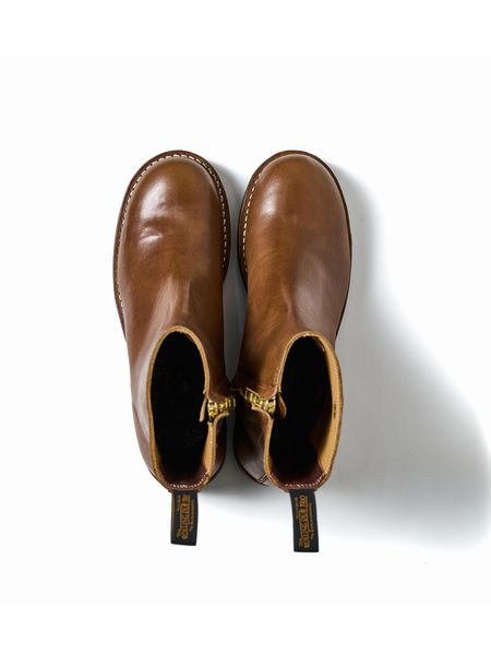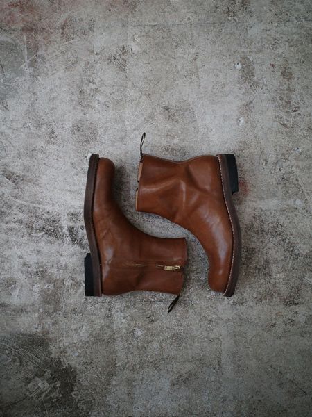 ROLLING DUB TRIO(ローリングダブトリオ)のCASPER(キャスパー)になります。リリース以降、多くの方にご愛用頂いている一枚革サイドジップブーツ。こちらはイタリアの老舗タンナーのホースフロントレザーを用いた一足です。クロムエクセルレザーに比べ光沢があり、馬革特有の細かいシワが入るのが特徴です。