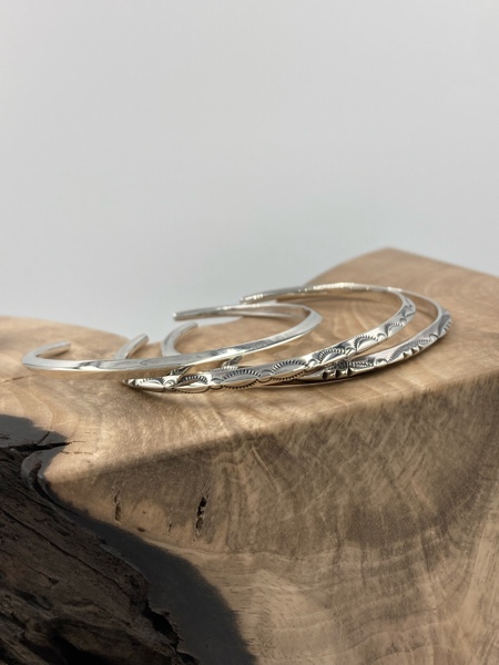 LARRY SMITH(ラリースミス)のトライアングルバングル-EXTRA THIN TRIANGLE BRACELET -3 POINT- になります。3角形部分にスタンプワークが施されたバングルになります。太さ0,3cmの細身で、さりげなく手元を飾れます。ワンサイズ展開で手首に合うように調整してお使いください。*MEN’S SIZE
