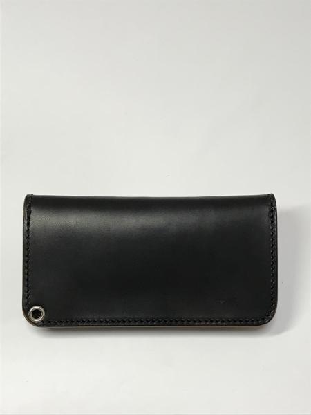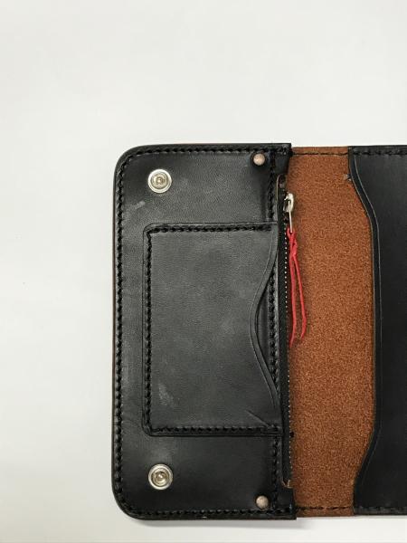 LARRY SMITH(ラリースミス)のBUTTERFLY TURQUOISE CUSTOM TRUCKER WALLET -M- Blackになります。中央にに BUTTERFLY TURQUOISE CONCHO、その下にBUTTERFLY SHELL CONCHO、そしてSHELL CONCHA-S-がウォレットの淵を囲うようにカスタムされたウォレットになります。通称”ローレンスレザー”というオイルをたっぷり染み込ませたLARRY SMITHオリジナルのサドルレザーを使用し、昔ながらの製法に拘ったトラッカーズウォレットです。丸く落とされたコバ、TALON42ジッパーからレザーを挟み込んだボタンなどクォリティの高い仕上がりになっています。収納は、お札用ポケットとコイン用ポケットを1つずつ、フリーポケットが3つ設けてあります。シンプルな中にもコダワリの詰まった逸品となっています。使い込む程に味わいが増す、長く使い続けて経年変化を楽しみたいウォレットです。
