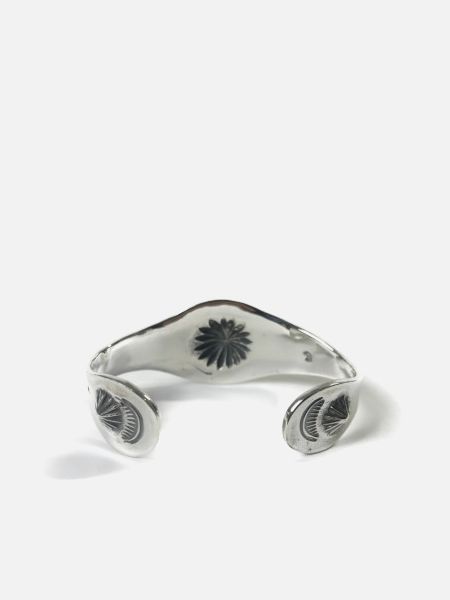 丸み(ラウンド)形状になったフロント面と二か所にシェルマークをハンマーワークで施しサイドはスタンプワークでデザインしたバングルブレスレットです。着け心地は、滑らかという言葉が1番しっくりくるほど手首に馴染みます。バングルの厚さ、形状、デザインも含め上品さあるバングルに仕上がっています。