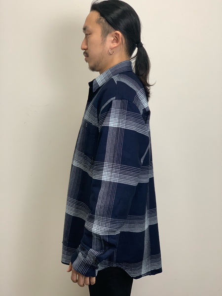 ループ染色(デニムのタテ糸を染める際に用いられる染色方法)を施したインディゴの糸で織り上げたワンウォッシュ綾織りのチェック生地を使用したワークシャツになります。