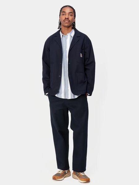 ミッドランドパンツは、ミッドウェイトのコットンツイル製で、レギュラーウエストのリラックスしたストレートフィットが特徴。ツールポケットとダブルステッチが特徴で、ワークスタイルの影響を感じさせる作り。カーハートWIPのスクエアラベルが全体のデザインを引き締めている。セットアップ着用が可能なブレザーも展開しています。