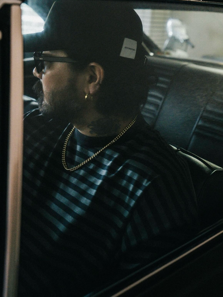 ポリエステルのMVSを使用しドライタッチが特徴のボーダー天竺を使用。 吸水速乾性に優れる。 ワイドシルエット。