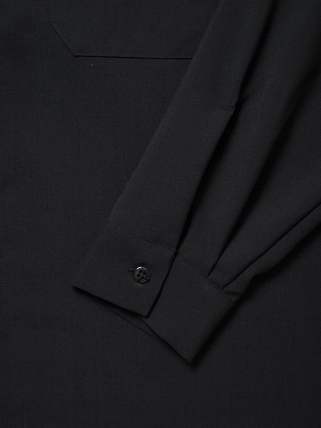 光沢とドレープが特徴のウールとポリエステル混紡のウォッシャブル平織生地を使用。今期から強撚糸を使用することによりドライなタッチと生地に程よいハリ感が備わっている。ワイドシルエット。