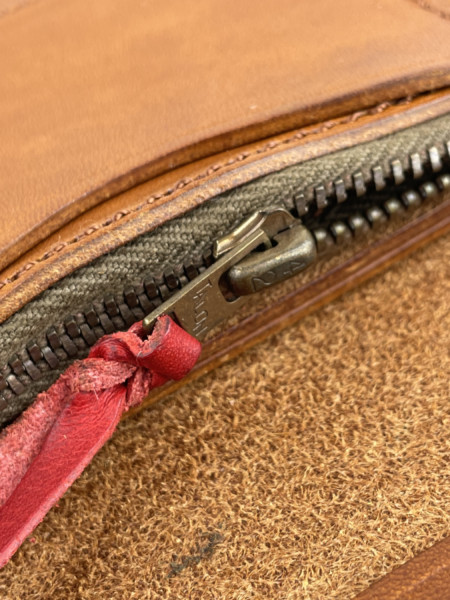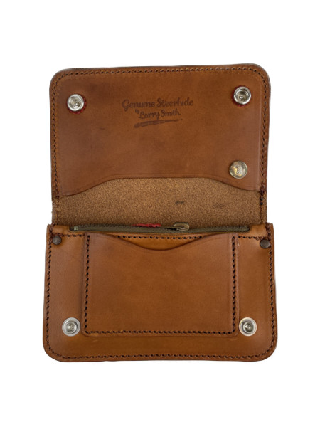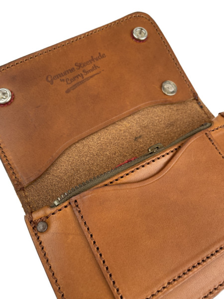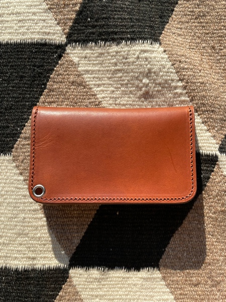 こちらはSサイズのトラッカーズウォレットにターコイズ石が埋め込まれたシェルコンチョがカスタムされたウォレットなります。通称”ローレンスレザー”というラリースミスのオリジナルサドルレザーを使用し、昔ながらの製法に拘ったトラッカーズウォレットです。染色から縫製まで全て国内の職人による手作業で作製しております。丸く落とされたコバ、TALON42ジッパーからレザーを挟み込んだボタンなどクオリティの高い仕上がりになっています。収納は、お札用ポケットとコイン用ポケットを1つずつ、フリーポケットが3つ設けてあります。シンプルな中にもコダワリの詰まった逸品となっています。使い込む程に味わいが増す、長く使い続けて経年変化を楽しみたいウォレットです。