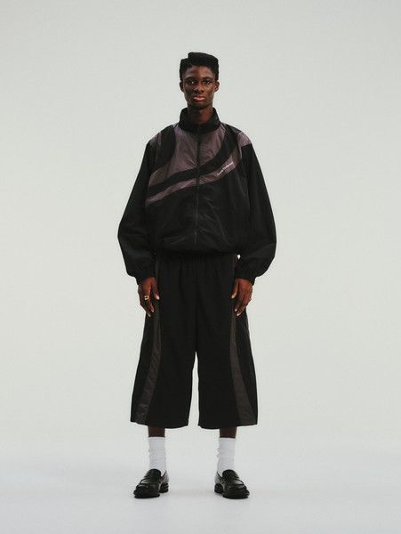 COOTIE PRODUCTIONS (クーティープロダクションズ)2026SS新作Nylon Paneling Shin Cut Wide Track Pantsになります。ナチュラルなシボ感を持つナイロン生地を使用。高密度で適度なハリ感を持ち、撥水性に優れる。メッシュ裏地が付く。ドローストリングのイージー仕様。脇 PKT 内にキーループが付く。8分丈のワイドシルエット。