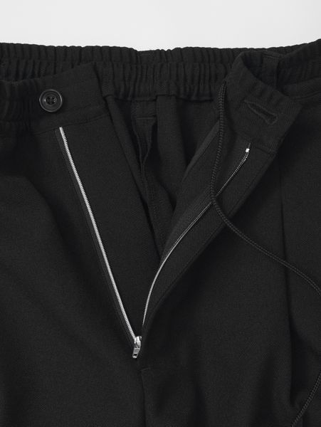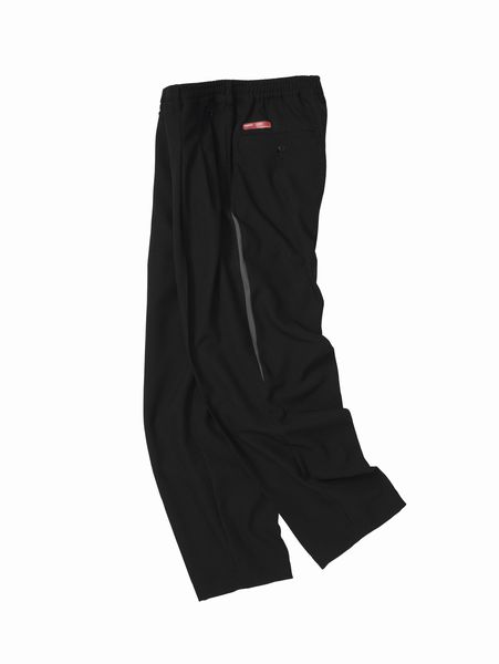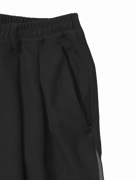 シルエットは、太すぎず細すぎない絶妙なテーパードラインで構成され、あらゆるスタイルに自然にフィットするバランス感が魅力。今作は、サイドに配色切り替えのテクニカルパネルを追加。ミニマルな定番フォルムに、ストリートと機能服の緊張感をプラスしたアップデート仕様。素材には、美しい微光沢を持つ日本製の高密度サージ生地を使用。スラックスの品とジャージの快適さを兼ね備えた、ハイブリッドなテキスタイル。ウエストはエラスティックバンドとスピンドルによるリラックス仕様で、日常的な着脱性と快適性を両立している。トレンドに左右されず、長く愛用できる高品質な日本製。ブランドのフィロソフィーを感じさせる、実用と設計の交差点にある一本。